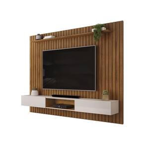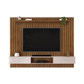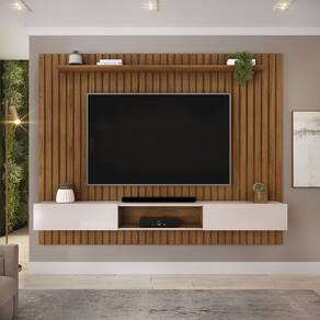 Destaca-se o acabamento em impressão ultravioleta com 8 camadas, que garante alta definição e resistência à umidade, além do ripado em MDF com recobrimento decorativo no espaço da TV, conferindo um visual contemporâneo e sofisticado ao ambiente. As duas portas basculantes proporcionam espaço adicional para armazenamento de itens diversos, mantendo a sala organizada e livre de bagunça.