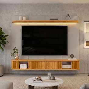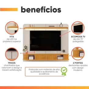DIFERENCIAIS: Estrutura 100% MDF / Pintura UV, 8 camadas / Painel com frisos chanfrados e acompanha fita de LED na prateleira extensa superior / 2 portas deslizantes ripadas / 1 nicho central para melhor armazenamento / Suporta TV de até 75.