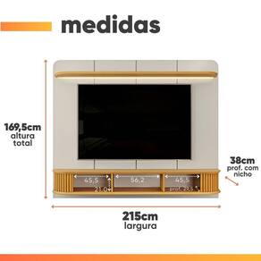 Importante sobre a entrega: A entrega é realizada até a portaria ou porta de entrada do endereço indicado, desde que o acesso seja permitido. Para locais com portaria, a entrega será feita no piso térreo. Não realizamos montagem, desmontagem, transporte por escadas ou içamento. É responsabilidade do cliente verificar se as dimensões do produto são compatíveis com portas, elevadores e corredores. Evite imprevistos: confira todos os detalhes antes de concluir sua compra. MEDIDAS PAINEL:: A = 169,5 cm L = 215 cm P = 38 cm | MEDIDA NICHO CENTRAL:: A = 21 cm L = 56,2 cm P = 29,5 cm | MEDIDAS PRATELEIRA:: L = 210 cm P = 20 cm | PRATELEIRA SUPORTA ATÉ:: 5 kg | NICHOS SUPORTAM ATÉ:: 5 kg | PESO SUPORTADO:: 40 kg | PESO:: 77,75 kg | IDEAL PARA TV DE ATÉ:: 75 Polegadas | MODELO:: Painel Para TV Até 75 Polegadas 2,15m Led 2 Portas Kai Dj Móveis | MARCA:: DJ Móveis | COR:: Off White / Madeirado | PINTURA:: UV, 8 camadas | ACABAMENTO:: Brilho | MATERIAL:: MDF | ESPESSURA DO MATERIAL DA ESTRUTURA:: 15 mm | PRATELEIRAS:: 1 | NICHOS:: 1 | PORTAS:: 2 | TIPO DE PORTA:: Deslizante | ESPAÇO PARA PASSAR FIOS:: Sim | SISTEMA DE MONTAGEM:: Minifix, cavilhas e parafusos | DIFERENCIAIS:: Estrutura 100% MDF / Pintura UV, 8 camadas / Painel com frisos chanfrados e acompanha fita de LED na prateleira extensa superior / 2 portas deslizantes ripadas / 1 nicho central para melhor armazenamento / Suporta TV de até 75 | ITENS INCLUSOS:: 1 painel, 1 manual de montagem, 1 kit parafusos. | INSTRUÇÕES E CUIDADOS:: Para maior durabilidade, recomendável que a limpeza dos móveis seja feita com pano limpo e seco. Não usar produtos químicos ou abrasivos. | GARANTIA:: 3 meses pelo fabricante. | AVISO: Importante sobre a entrega: A entrega é realizada até a portaria ou porta de entrada do endereço indicado, desde que o acesso seja permitido. Para locais com portaria, a entrega será feita no piso térreo. Não realizamos montagem, desmontagem, transporte p | Altura: 169 cm | Largura: 215 cm | Profundidade: 38 cm | Inclui manual de montagem: Sim | Altura da embalagem: 22 cm | Comprimento da embalagem: 218 cm | Largura da embalagem: 55 cm | Peso da embalagem: 79700 g | Requer montagem: sim | Quantidade de caixas de embalagem: 2 | Cor: Off White / Madeirado