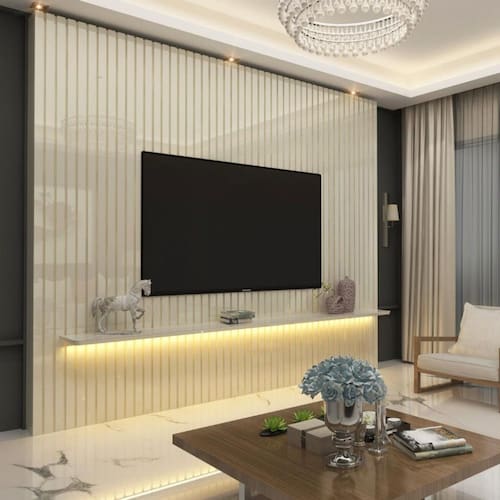 Características: Estrutura em MDF Painel com ripas Led em luz quente com difusor 1 Prateleira chanfrada com bordas laqueadas Suporta TVs de até 85 polegadas Produto com acabamento atóxico