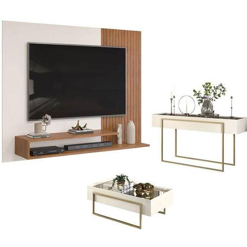 Painel para Tv Nando Freijó Off White com Aparador Pilar e Mesa de Centro Pilar Off White DJ Móveis
