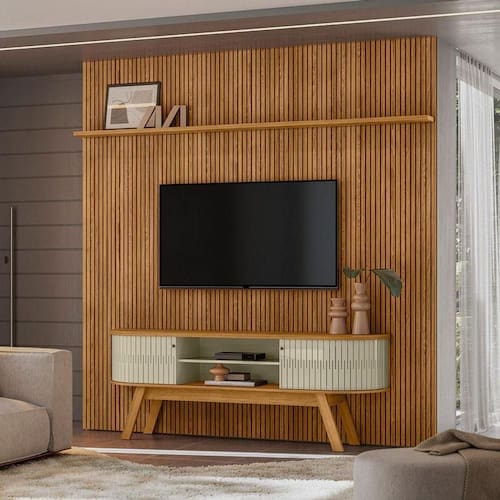 Painel Piso Teto New Guaporé com Rack Bancada Valência New Laguna Ambiente Cumaru Opala - Madetec