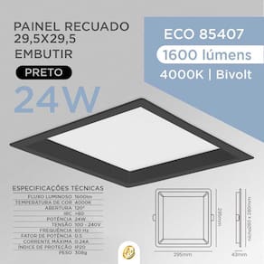 Painel Plafon Led De Embutir 24W Recuado Quadrado 29,5X29,5