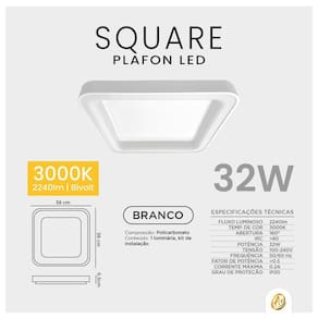 Transforme seu ambiente com a beleza do Plafon Square Seu formato quadrado e acabamento branco conferem uma estética moderna e elegante à sua decoração. Com LED integrado de 3000K - branco quente, ele oferece uma luz suave e acolhedora, criando uma atmosfera aconchegante em cada cantinho do seu espaço. Com 32W e 2240 lumens, esse plafon proporciona uma iluminação potente e eficiente, tornando-o ideal para diversos ambientes. Deixe o Plafon Square brilhar em sua decoração e transforme seu espaço com estilo e luminosidade.