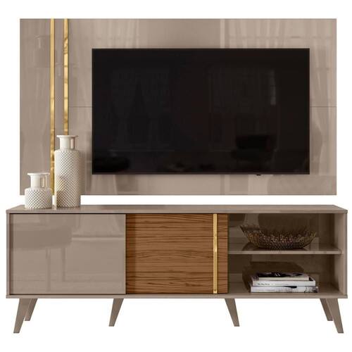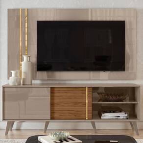 Painel e Rack Bancada Cronos, conjunto funcional composto por 2 peças com design atual e detalhes em dourados. Ambos com estrutura em MDP 15mm. O painel acomoda TVs de até 60 polegadas (suporta até 25kg), com passa fios central e detalhe lateral em perfil dourado. O rack possui 2 portas de correr (sendo uma com detalhe em perfil dourado) com sistema de abertura por trilho plástico, 1 prateleira lateral com passa fios e 6 pés estilo retrô (em plástico). Acabamento em pintura UV texturizada (fosca e brilho). Este móvel chegará em sua casa separado em 02 volumes.