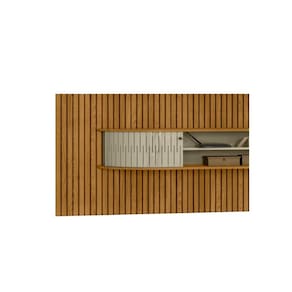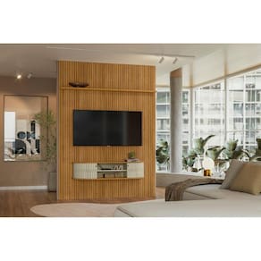 O Painel Piso-Teto New Monte Carlo traz sofisticação e modernidade para sua sala de estar. Com 1,54m de largura e 2,44m de altura, ele preenche sua parede do piso ao teto, suportando TVs de até 65 polegadas fixadas diretamente no painel frisado em MDF.