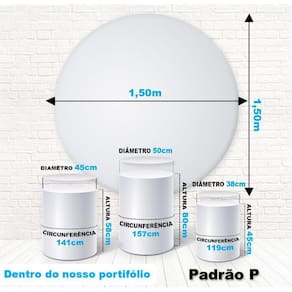 Capas de cilindro: Não acompanha cilindros de mdf Medidas padrão p do anúncio Cilindro grande: altura: 80 cm x diâmetro: 50 cm x circunferência: 157 cm Cilindro médio: altura: 58 cm x diâmetro: 44 cm x circunferência: 141 cm Cilindro pequeno: altura: 45 cm x diâmetro: 38 cm x circunferência: 119 cm