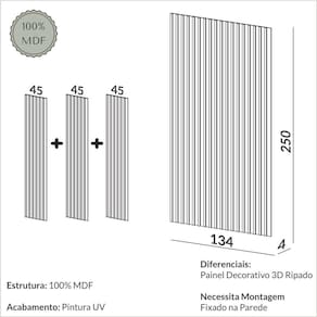 Painel ripado de 134cm largura e 250cm altura, acabamento pintura UV 7 camadas na cor Freijo, alta durabilidade, ideal para acabamento de parede, pode ser utilizado como painel para televisão. Adquira também as prateleiras avulsas, para compor com este painel..... Acompanha Ficha Técnica: Sim Acompanha Manual de Instalação: Sim Ambiente Principal: Sala de Estar Ambientes Recomendados: Área Comercial/Área Residencial Área Indicada: Interna Comprimento: 250 cm Cor: Freijó Madeirado Cor do Produto: Freijó Madeirado Escala de Brilho: Fosco Espessura: 40 mm Formato: Retangular Largura: 134 cm Local de Instalação: Áreas Internas Manual de Montagem e Instalação: https://product-hub-prd.madeiramadeira.com.br/628869766/documents/6eff85ec-8f09-4de6-bc41-d93c11b95f4b3135908378117551798548402.pdf Marca: Dalla Costa Material Principal: MDF Origem do Produto: Nacional Permite Reutilização: Sim Peso por Caixa: 40 kgKg Peso Por Unidade: 38,5 kg Pode ser Pintado: Não Recomendações de Uso, Manutenção e Limpeza: Pano seco Resistência a Risco: Média Resistência ao Fogo: Não Tipo de Instalação: Parafusado Tipo de Painel Ripado: Placa