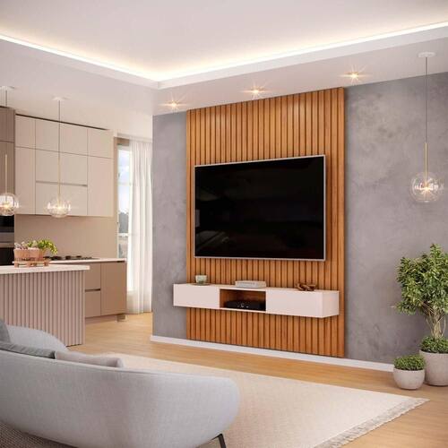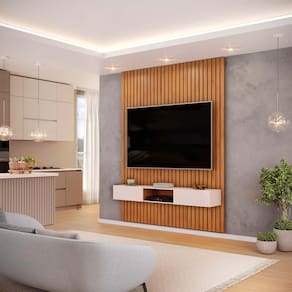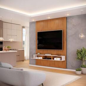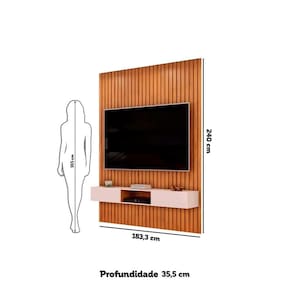 O Painel e Bancada Trento é um produto ível e elegante que pode ser o destaque de diferentes ambientes no seu lar. Disponível em 5 larguras e 2 alturas diferentes, ao escolher qual se adequa mais no seu ambiente você garante um encaixe perfeito. Toda sua extensão é composta de peças ripadas de MDF de 15mm, que são chapas de madeira reconstituída advindas de reflorestamento, matéria prima que não prejudica o ambiente e garante durabilidade e resistência ao seu produto. Além disso o Painel Ripado Trento conta com uma ampla prateleira de 25mm de espessura e com borda chanfrada, onde você pode manter objetos decorativos em posição de destaque. A Bancada Suspensa está disponível em duas larguras diferentes de acordo com o tamanho escolhido do painel, e conta com gavetas com charmosos detalhes usinados, trazendo uma maior sofisticação ao conjunto. Este produto comporta TVs de até 65, enquanto a resistência do Painel é de até 40Kg, lembrando disso você consegue comprar a TV ideal para usar em conjunto com este móvel, garantindo o melhor do entretenimento para sua família. Não se preocupe com os cabos, este produto possui passa-fios para facilitar a organização dos cabos por trás do produto. O Painel Ripado Trento com Bancada Suspensa é um produto cheio de benefícios, perfeito para dar aquele toque especial na sua casa, aproveite e torne seu lar mais aconchegante com este lindo produto.