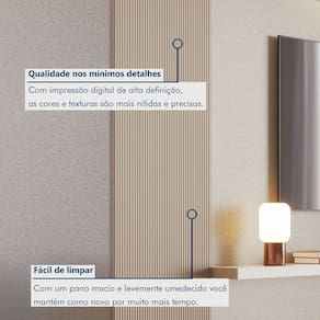 A instalação é simples e prática, sem necessidade de colas. Os painéis são fixados diretamente na parede através de réguas com parafusos e buchas, todos incluídos.