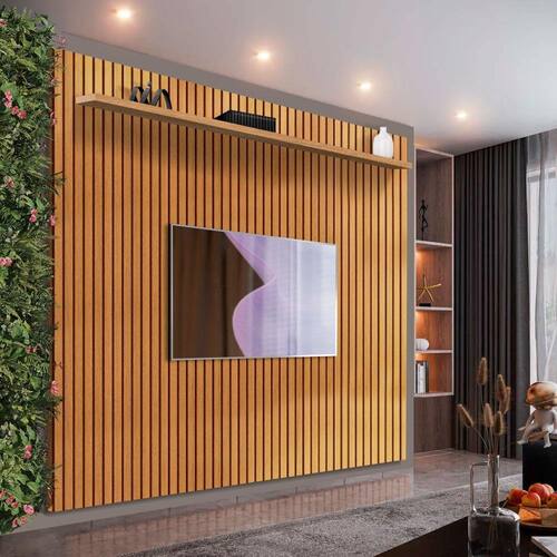 Este painel destaca-se pelo autêntico design ripado, confeccionado em MDF/MDP. Adequado para TVs de até 75 polegadas, oferece prateleira espaçosa para aparelhos eletrônicos ou enfeites decorativos. Seu estilo moderno e elegante complementa qualquer espaço de forma única.