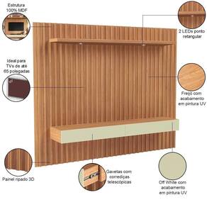 Altura: 183 cm | Color: Freijó | ColorFamily: Freijó | ColorSimple: Freijó | ColorSupplier: Freijó Off White | Com compartimento para alto-falantes: Não | Com rodas: Não | Cor: Freijó Off White | Formato do móvel: Painel Suspenso | Largura: 223 cm | Materiais do corpo: MDF | Material: MDF | Material da estrutura: MDF | Material das corrediças: Telescópicas | MaterialFamily: MDF | Model: Baraka | OriginCountry: | OriginState: PR | Peso: 76 kg | ProductContents: 01 Painel | ProductHeight: 183 cm | ProductInstructions: Produto para uso em ambiente interno, nao devendo ficar exposto ao sol, calor e umidade excessivos. | ProductLength: 38 cm | ProductWarranty: 90 dias após o do produto | ProductWeight: 76 kg | ProductWidth: 223 cm | Profundidade: 38 cm | Quantidade de gavetas: 2 | Quantidade de prateleiras: 1 | Requer montagem: Sim | SizeDescription: Altura: 183 cm x Largura: 223 cm x Profundidade: 38 cm | SupplierSimpleName: Painel Ripado Para 65 Pol com LED 2 Gavetas 223cm Baraka D03 Freijó Off White - Lyam Decor | Tamanho máximo de : 65 Polegadas