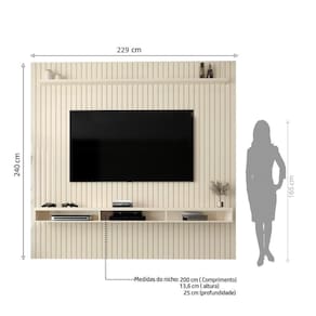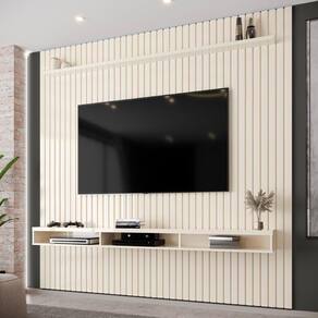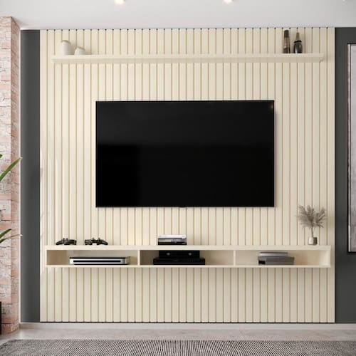 Cor: Cedro | Fabricante: EDN | Produto: Painel | Altura: 240cm | Largura: 229cm | Cômodo Indicado: Sala de Estar | Material da Estrutura: MDP | Suporta TV até: 75 Polegadas | Número de Portas: Não Possui | Possui Nichos: Sim | Possui Gavetas: Não | Possui Portas: Não | Acabamento: Ripado Cor: Off White