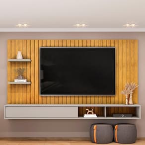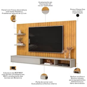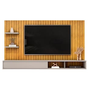 As linhas clean e a textura única dos frisos que remetem ao ripado não apenas embelezam o ambiente, mas também criam uma sensação de amplitude, ideal para aqueles que desejam maximizar cada centímetro. E não se preocupe mais com a falta de espaço para sua televisão! Esse painel suporta TVs de até 60 polegadas, permitindo que você desfrute de suas séries e filmes favoritos com total conforto e estilo. A bancada suspensa oferece um suporte seguro e prático para todos os seus eletrônicos e acessórios. Ah, além disso, ela garante uma área de circulação fluida, permitindo que você se movimente à vontade, enquanto a decoração se destaca.
