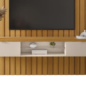 ESPECIFICAÇÕES: Estrutura em MDP e MDF com espessuras de 40mm e 15mm Pintura UV Réguas de fixação na parede em MDF 2 Portas basculantes Dobradiças metálicas Prateleira superior Puxadores em alumínio na cor champanhe Tampo com espessura de 40mm Prateleira de vidro 6mm com suportes de silicone Ideal para TV até 70"