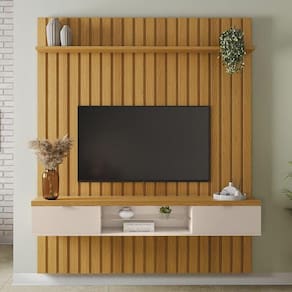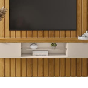 Painel Ripado You Illusion Cinamomo/off White Para Até 70 - Hb Móveis Cinamomo/off White Painel Ripado You Illusion para até 70 - HB Móveis O Painel Ripado You Illusion possui design moderno que deixa o ambiente elegante e valoriza ainda mais a sala de estar. O painel conta com um visual marcante ripado, duas portas basculantes, puxadores em alumínio e uma prateleira superior. ESPECIFICAÇÕES: - Estrutura em MDP e MDF com espessuras de 40mm e 15mm - Pintura UV - Réguas de fixação na parede em MDF - 2 Portas basculantes - Dobradiças metálicas - Prateleira superior - Puxadores em alumínio na cor champanhe - Tampo com espessura de 40mm - Prateleira de vidro 6mm com suportes de silicone - Ideal para até 70