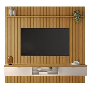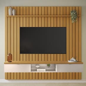 Painel Ripado You Illusion Cinamomo/off White Para Até 70 - Hb Móveis Cinamomo/off White Painel Ripado You Illusion para até 70 - HB Móveis O Painel Ripado You Illusion possui design moderno que deixa o ambiente elegante e valoriza ainda mais a sala de estar. O painel conta com um visual marcante ripado, duas portas basculantes, puxadores em alumínio e uma prateleira superior. ESPECIFICAÇÕES: - Estrutura em MDP e MDF com espessuras de 40mm e 15mm - Pintura UV - Réguas de fixação na parede em MDF - 2 Portas basculantes - Dobradiças metálicas - Prateleira superior - Puxadores em alumínio na cor champanhe - Tampo com espessura de 40mm - Prateleira de vidro 6mm com suportes de silicone - Ideal para até 70