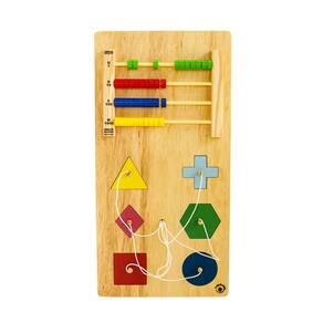O segundo módulo é composto de 6 figuras geométricas conectadas por um cordão e que encaixam e desencaixam do painel, além de um ábaco fechado.