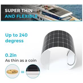 O Painel Solar Monocristalino Flexível Renogy 200W é uma excelente opção para quem busca alta potência de saída. Com capacidade média de fornecer 1000 Watt horas de eletricidade por dia, calculado com 5 horas de luz solar, é um produto eficiente e econômico. Além disso, é fácil de transportar e instalar, adaptando se à maioria das superfícies curvas, pois é dobrável em 240 graus. Com peso de apenas 12 do painel rígido e aparência totalmente preta e sem brilho, é discreto e elegante. Equipado com tecnologia de célula PERC halfcut, que melhora a captura de luz solar e o desempenho elétrico, este painel solar apresenta tecnologia líder da indústria. É confiável e durável, funcionando com caixa de junção à prova d água com classificação IP67 e conectores solares, suportando até 5.400 Pa de carga de neve pesada e até 2.400 Pa de vento forte. Pronto para instalação, o painel vem com furos de montagem pré perfurados e cabos conectores solares longos de 12 AWG 27,6 pol., possibilitando instalação rápida e fácil.