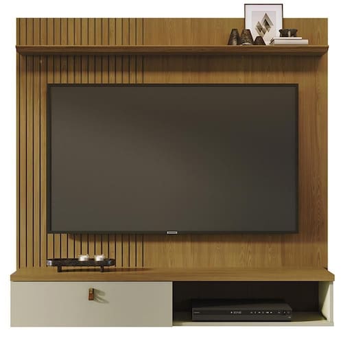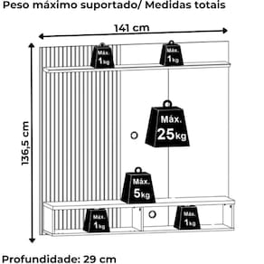 Peso máximo suportado: 34Kg (painel 25kg, prateleira superior 2kg, tampo 5kg e nicho 1kg cada)