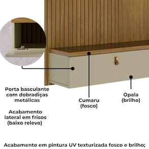 Painel Suspenso Iris, com design funcional e detalhes frisados que valorizam o seu ambiente. Estrutura em MDP 15mm, (base/porta 15mm e tampo/prateleira 25mm). Composto por porta basculante com dobradiças metálicas, nicho aberto, prateleira superior com borda chanfrada e passa fios. Destaque para o detalhe lateral Frisado de baixo relevo (em MDF 12mm). Puxador que simula couro l (em plástico) com acabamento fosco. Acabamento em pintura UV texturizada fosca e brilho. Este móvel chegará em sua casa separado em 01 volume.