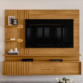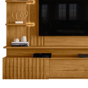 Painel Suspenso Atena, com visual moderno inspirado em mármore e composição rica em detalhes ripados. Estrutura em MDP 15/25 mm (base 15 mm e prateleira/tampo 25 mm), ideal para TVs de até 65 polegadas (suporta até 57 kg). Conta com 3 portas de correr com sistema de abertura por trilho plástico, sendo uma delas com detalhes em ripado vertical, o mesmo detalhe aplicado à lateral do painel. Possui 2 prateleiras laterais com fitas de LED integradas e passa fios central. Acabamento em pintura UV texturizada (fosca e brilho). Este móvel chegará em sua casa separado em 02 volumes.