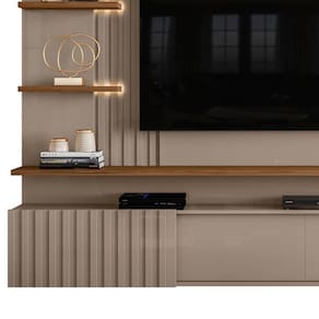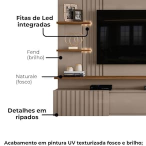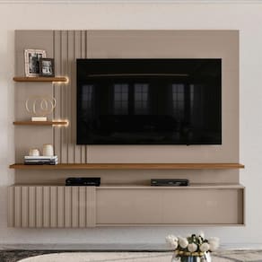 Painel Suspenso Atena, com visual moderno inspirado em mármore e composição rica em detalhes ripados. Estrutura em MDP 15/25 mm (base 15 mm e prateleira/tampo 25 mm), ideal para TVs de até 65 polegadas (suporta até 57 kg). Conta com 3 portas de correr com sistema de abertura por trilho plástico, sendo uma delas com detalhes em ripado vertical, o mesmo detalhe aplicado à lateral do painel. Possui 2 prateleiras laterais com fitas de LED integradas e passa fios central. Acabamento em pintura UV texturizada (fosca e brilho). Este móvel chegará em sua casa separado em 02 volumes.