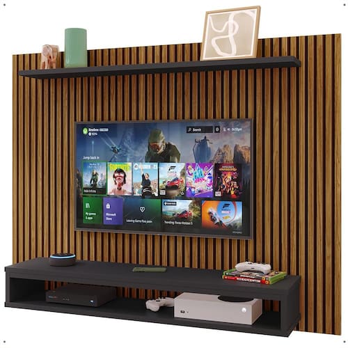 Conta com uma prateleira superior ideal para armazenar itens decorativos e um amplo nicho inferior, podendo ser utilizado para armazenar itens eletrônicos, como: videogame, controles, entre outros.