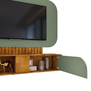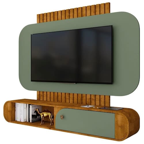 Painel Suspenso Jurerê, design orgânico e atual! Estrutura em MDP/MDF (12/15mm) com acabamento em pintura UV texturizada. Possui nicho central, porta basculante com dobradiças metálicas, puxador estilo Amalfi (plástico), passa fios, detalhes usinadas com bordas curvas e ripados decorativos (MDF 12 mm em baixo relevo). Suporta TVs de até 55 polegadas com segurança. Fixação por meio de parafusos. Este produto será entregue em 1 volume