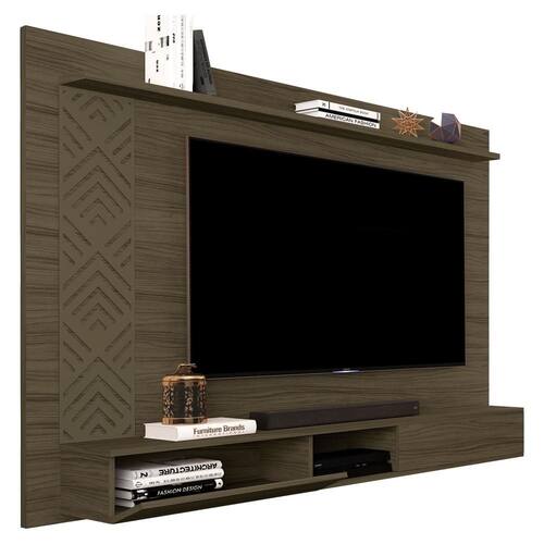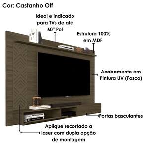 Painel Suspenso Roma, sofisticado e exclusivo, pensado para quem busca se destacar com elegância! Estrutura 100% MDF de (15/25 mm) e acabamento UV fosco. Composto por portas basculantes de dobradiças metálicas (suportando até 3 kg cada), prateleira superior, nicho central e detalhe em aplique lateral em MDF, recortado a laser com dupla opção de montagem (frente ou verso - possibilitando a escolha da cor durante a montagem). Suporta com segurança TVs de até 60 polegadas. NÃO ACOMPANHA TV NEM DEMAIS DECORAÇÕES. Este produto será entregue em 1 volume.