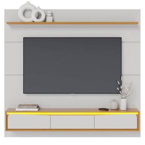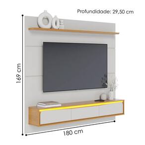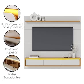 O Painel Tahiti destaca a sala de estar com design moderno e elegante. Possui estrutura 100% MDP 15/12 mm com acabamento em pintura UV. Conta com prateleira superior chanfrada, portas basculantes com detalhes em bordas curvas usinados e dobradiças metálicas, painéis com transições suaves, além de nicho central exposto com iluminação LED sutil embutida (fita LED com fonte já inclusa). Ainda conta com passa fios e suporta TVs de até 65" com segurança. TELEVISÃO E DEMAIS DECORAÇÕES NÃO INCLUSAS. Produto será entregue em 2 volumes.