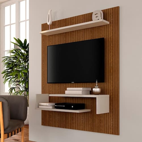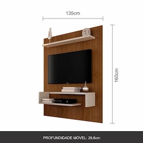 O Painel Sonora para TV até 55”, possui prateleiras para uma ótima organização e o aproveitamento de espaço com beleza e design.Medida do Painel:- Medida do painel montada: AxLxP:160CM x 135CM x 26,4CMDetalhes Técnicos Do Painel:- PAINEL PARA TV ATÉ 55” (POLEGADAS)- Material Painel: MDP 15 E 25MM (prateleiras)- Acabamento : Pintura U.V texturizado- Peso Suportado do nicho: 15KG- Tonalidade : Off white/Freijó ripado- Fixado na Parede: Fixado com régua (MDP 15MM)- Estruturado com material de altíssima qualidade, evitando fungos e mofo.Conteúdo da Embalagem:- 01 Painel-Acessórios para montagem- Manual de MontagemObservações Importantes:- As imagens ambientadas são meramente ilustrativas e podem apresentar itens que não incorporam o produto;- Todos os nossos produtos são novos, acompanham documento fiscal e possuem garantia de 3 meses, essa garantia cobre somente defeitos de fabricação;- A entrega só será efetuada no endereço do CEP, caso o endereço seja diferente do CEP informado no pedido, a entrega terá cobrança adicional e o comprador arcará com as despesas;- Não realizamos entregas para zonas rurais, via caminhos fluviais e distritos, por isso não aceitamos CEP GERAL da região;- Não é possível realizar o agendamento de entrega do produto, é necessário que acompanhe o rastreio de seu pedido para saber a previsão de entrega;- As entregas somente serão realizadas para um responsável maior de idade (+18);- Enviamos para diversos estados, sendo assim nossas entregas são realizadas por transportadoras parceiras de nossa empresa. Confira as dimensões antes da compra e certifique-se de que o produto passará por elevadores, portas e corredores já que nossa entrega não inclui a subida de lances de escada, transporte por elevador e o lançamento de produtos, em caso de condomínios residenciais a entrega é feita somente até a portaria. Todas as entregas são realizadas em dias e horários comerciais;- Ao receber os seus produtos observe se a embalagem se encontra em perfeitas condições. Se você adquiriu algum móvel, confira atentamente a quantidade de volumes e o aspecto físico das embalagens. Confira também se a cor do móvel está de acordo com o seu pedido;- O prazo de cancelamento por arrependimento é de até 7 dias corridos a contar da data de recebimento;- Os produtos e assistências são enviados DESMONTADOS, MONTAGENS E DESMONTAGENS recomendamos sempre a contratação de um montador profissional e é válido lembrar que o custo desses serviços é por conta do comprador;- Objetos decorativos que aparecem na foto não acompanham o produto;- Evitar a exposição direta à luz solar e à umidade;- Para limpeza, limpar com pano macio e seco, não utilizar qualquer outro tipo de produtos químicos;- As cores do produto podem variar de acordo com o monitor, a iluminação do ambiente ou sua percepção visual;