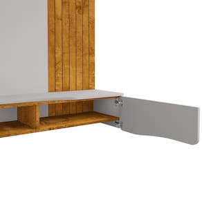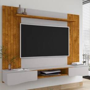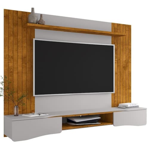 Painel Suspenso Búzios, design orgânico, tampo curvo sobreposto e laterais frisadas. Estrutura em MDP (15/25mm) com acabamento em pintura UV texturizada. Possui portas com dobradiças metálicas, prateleira superior (25mm), nicho central e laterais com frisados decorativos (MDF 15mm baixo relevo). Suporta Tvs de até 65 polegadas com segurança. Fixação por meio de parafusos. Este produto será entregue em 1 volume.
