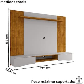 Painel Suspenso Búzios, design orgânico, tampo curvo sobreposto e laterais frisadas. Estrutura em MDP (15/25mm) com acabamento em pintura UV texturizada. Possui portas com dobradiças metálicas, prateleira superior (25mm), nicho central e laterais com frisados decorativos (MDF 15mm baixo relevo). Suporta Tvs de até 65 polegadas com segurança. Fixação por meio de parafusos. Este produto será entregue em 1 volume.