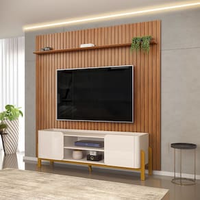 Características: Estrutura em MDF e MDP Acabamento em UV Pés em Madeira Maciça Bordas Arredondadas Tampo Tipo Bandeja 02 Portas de Giro Usinadas 01 Prateleira 04 Nichos Painel Ripado Dobradiças com Amortecimentos Suporta: Tampo 40 kg, prateleira 2 kg e base 5 kg Ideal para TV até 75 Polegadas
