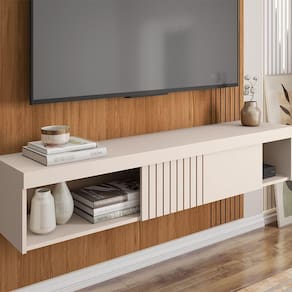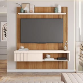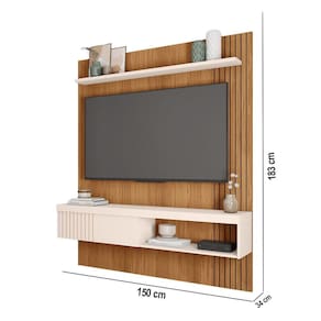 Painel Tv 55 Pol 150cm Bancada Suspensa Ripado Luana C01 - D'rossi Cor Freijó/off White Transforme sua sala com o Painel TV 55 Pol 150cm Bancada Suspensa Ripado Luana! Fabricado em MDP e MDF com acabamento em pintura UV fosca, oferece durabilidade e toque contemporâneo. Seu design moderno se destaca pelo detalhe ripado em baixo relevo na porta deslizante e nas laterais, agregando charme e sofisticação ao ambiente. Ideal para TVs de até 55 polegadas, suporta até 33kg distribuídos. Conta com prateleira e nicho para organizar eletrônicos, decoração ou objetos do dia a dia. A porta deslizante com puxador embutido facilita o acesso, mantendo o visual limpo e elegante. Prático, possui passa fio para maior organização dos cabos. Suspenso e sem pés, valoriza ambientes compactos e facilita a limpeza. Uma escolha perfeita para quem busca funcionalidade, modernidade e estilo na decoração! Dimensões do Produto: Altura: 183 cm Largura: 150 cm Profundidade: 34 cm Peso: 44 kg Especificações do Produto: Material da Estrutura: MDP 12mm, MDF 12mm e MDP 15mm Acabamento: Pintura UV Escala de Brilho: Fosco Ideal para TVs de até: 55 Polegadas Peso Suportado: 33 kg distribuídos Possui Prateleiras: Sim Quantidade de Prateleiras: 1 Prateleira Possui Nichos: Sim Quantidade de Nichos: 1 Nicho Possui Portas: Sim Quantidade de Portas: 1 Porta Tipo de Portas: Deslizante Possui Passa Fio: Sim Possui Gavetas: Não Possui Puxador: Sim,Embutido Possui LED: Não Possui Espelho: Não Possui Pés: Não Diferenciais: Design moderno; Painel suspenso, Porta e lateral com detalhe ripado em baixo relevo. Sistema de Montagem: Parafusos/Cavilhas/Minifix Manual de Montagem: Sim Complexidade da Montagem: Média Montagem: Recomendamos que seja feita por um profissional Garantia: 90 dias contra defeito de fabricação Instruções de Limpeza: Utilizar um pano limpo e levemente úmido Quantidade de Volumes: 1 Caixa Medida das Embalagens: Caixa 1: 190x61,5x7,6cm Entrega: É feita somente até o térreo ou portaria. Confira sempre as medidas das embalagens para assegurar que o produto passe por portas e escadas do local.
