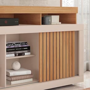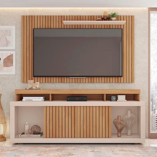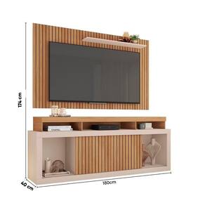 Painel Tv 60 Pol 180cm E Bancada Com Rodízio Sala Navel C01 - D'rossi Cor Buriti/off White Eleve o visual da sua sala com o Painel para TV até 60e Bancada Navel. Modernidade, praticidade e elegância em um só produto, perfeito para criar um ambiente aconchegante e funcional. Este conjunto é produzido com materiais de alta qualidade, como MDP e MDF, aliando durabilidade e acabamento superior. Seu design elegante conta com painel para TVs de até 60 polegadas, na bancada as portas são deslizantes em MDF com ripado de baixo relevo e fundo preto, diferencial que destaca ainda mais o móvel no ambiente. Além disso, ele oferece ampla organização, com prateleiras e nichos ideais para eletrônicos, objetos decorativos. A praticidade está presente nos rodízios embutidos que facilitam a movimentação do móvel para limpeza ou mudança de posição. Aproveite para trazer mais elegância ao seu espaço! Dimensões do Produto: Altura: 174 cm Largura: 180 cm Profundidade: 40 cm Peso: 55 kg Especificações do Produto: Material da Estrutura: MDP 12mm, MDP 15mm, MDF 12mm, HDF 3mm Acabamento: Pintura UV Escala de Brilho: Fosco Suporta TV de até: 60 Polegadas Peso Suportado: 90 Kg Distribuídos Possui Portas: Sim Quantidade de Portas: 2 Portas Tipo de Porta: Deslizante Possui Puxador: Não possui Possui Gavetas: Não possui Possui Prateleiras: Sim Quantidade de Prateleiras: 4 Prateleiras Possui Nichos: Sim Quantidade de Nichos: 5 Nichos Possui Passa Fio: Sim Possui Pés: Sim Tipo de Pés: Rodízios embutido Possui regulagem de altura: Não Diferenciais: Design sofisticado; Porta MDF ripada em baixo relevo com fundo preto. Sistema de montagem: Parafusos/Cavilhas/Minifix Manual de Montagem: Sim Complexidade da Montagem: Média Montagem: Recomendamos que seja feita por um profissional Garantia: 90 dias contra defeito de fabricação Instruções de Limpeza: Utilizar um pano limpo e levemente úmido Quantidade de Volumes: 1 Caixa Medida das Embalagens: Caixa 1: 186,2x47,2x13,5cm Entrega: É feita somente até o térreo ou portaria. Confira sempre as medidas das embalagens para assegurar que o produto passe por portas e escadas do local.