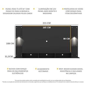 O Painel TV 65" com 2 Leds e Prateleiras de Vidro Vegas Premium Multimóveis é produzido em MDP, que garante maior durabilidade, resistência e facilidade na limpeza. As luminárias em LED, que acompanham o painel, proporcionam um visual mais bonito e moderno, deixando o ambiente aconchegante para você curtir os melhores filmes e séries. Com design minimalista e de fácil instalação você pode escolher em qual lugar do móvel deseja fixar. Com luz brilhante, as luminárias funcionam com 3 pilhas AAA que já estão inclusas. O painel para TV de até 65 (suporta até 30 Kg) com espaçamento para a passagem dos fios, que deixa o visual clean e os cabos organizados conta, ainda, com 4 prateleiras em vidro para você decorar o ambiente com sofisticação e elegância e 3 nichos para acomodar os equipamentos eletrônicos. Uma escolha inteligente e super em conta para deixar sua sala mais bonita e confortável.
