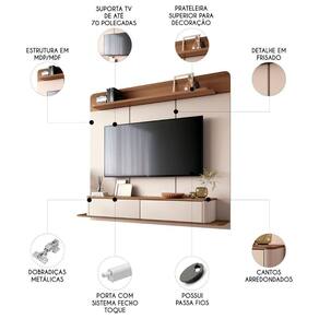 Com capacidade para TVs de até 70 polegadas, é ideal para transformar salas de estar em espaços modernos e confortáveis. Seu design combina de forma harmoniosa linhas retas com cantos arredondados, inspirado nas tendências atuais do design orgânico. A Bancada Suspensa oferece um efeito visual leve, ao mesmo tempo em que proporciona espaço funcional para organizar seus eletrônicos e acessórios. As duas portas basculantes, equipadas com dobradiças metálicas e sistema de abertura fecho toque, garantem praticidade e sofisticação, além de otimizar o uso do espaço. Esse sistema de fechamento garante que o móvel tenha uma aparência clean e sem puxadores, mantendo a estética do ambiente impecável. O Painel Com Bancada é produzido com MDP e MDF, nas espessuras de 25mm e 15mm, conferindo robustez e durabilidade. A prateleira superior de 25mm, adiciona uma camada extra de resistência, sendo perfeita para apoiar objetos decorativos ou outros itens que complementem a decoração. O Painel de TV é a escolha perfeita para quem deseja um móvel de destaque, que une design contemporâneo com praticidade e resistência.