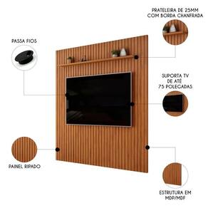 Com capacidade para suportar Tvs de até 75 polegadas, este Painel permite que você escolha a TV ideal para aproveitar o melhor do seu entretenimento, sem preocupações. Sua estrutura é composta por peças ripadas de MDF 15mm com acabamento em pintura UV, proporcionando alta resistência e durabilidade ao móvel. Conta com uma prateleira de 25mm com borda chanfrada, que pode ser instalada tanto na parte superior quanto na inferior e é ótima para exibir objetos decorativos com destaque. Além disso, o Painel Ripado dispõe de passa-fios para facilitar a organização e esconder os cabos, mantendo seu ambiente sempre limpo e organizado.