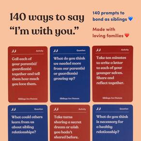 Fortaleça seu vínculo de irmãos: cultive conexões mais profundas com seus irmãos e irmãs através de Siblings Are Human, um jogo de cartas propositalmente criado para melhorar seu relacionamento por meio de conversas significativas e atividades compartilhadas, promovendo um vínculo mais profundo e gratificante entre irmãos. CONVERSAS PROVOCADORAS DE PENSAMENTO: envolva-se em 100 cartões de perguntas criados para iniciar discussões profundas, promovendo empatia, compreensão e vulnerabilidade enquanto você explora tópicos que aprofundam sua conexão e fortalecem seu vínculo, criando oportunidades para conversas sinceras que melhoram seu relacionamento entre irmãos em níveis emocionais e relacionais. Engajamento divertido: infunda elementos de coragem e brinque na dinâmica de seus irmãos com 40 cartas de atividades que inspiram experiências divertidas e aventureiras, oferecendo oportunidades para risos compartilhados e momentos memoráveis que enriquecem seu vínculo com espontaneidade e alegria, promovendo uma conexão mais profunda por meio de atividades e experiências compartilhadas. EXPLORAÇÃO PROGRESSIVA: Comece sua jornada com a exploração alegre do nível 1 do relacionamento entre irmãos, fazendo a transição gradual para discussões mais profundas e introspectivas do Nível 2 quando chegar a hora certa, permitindo que você navegue pela evolução do seu vínculo no seu próprio ritmo enquanto aprofunda continuamente sua conexão com seus irmãos. Memórias valorizadas: Transforme suas interações em memórias duradouras e utilize o formato adaptável do jogo para criar lembranças personalizadas que comemoram sua jornada, celebrando o vínculo único que você compartilha com seus irmãos e honrando o crescimento e a profundidade do seu relacionamento de uma maneira tangível e significativa. - Fortaleça seu vínculo de irmãos: cultive conexões mais profundas com seus irmãos e irmãs por meio de Siblings Are Human, um jogo de cartas criado propositalmente projetado para melhorar seu relacionamento por meio de conversas significativas e atividades compartilhadas, promovendo um vínculo mais profundo e gratificante entre irmãos - CONVERSAS PROVOCADORAS DE PENSAMENTO: envolva-se em 100 cartões de perguntas criados para iniciar discussões profundas, promovendo empatia, compreensão e vulnerabilidade enquanto você explora tópicos que aprofundam sua conexão e fortalecem seu vínculo, criando oportunidades para conversas sinceras que melhoram seu relacionamento entre irmãos em níveis emocionais e relacionais - Engajamento divertido: infunda elementos de coragem e brinque na dinâmica de seus irmãos com 40 cartas de atividades que inspiram experiências divertidas e aventureiras, oferecendo oportunidades para risos compartilhados e momentos memoráveis que enriquecem seu vínculo com espontaneidade e alegria, promovendo uma conexão mais profunda por meio de atividades e experiências compartilhadas - EXPLORAÇÃO PROGRESSIVA: Comece sua jornada com a exploração alegre do nível 1 do relacionamento entre irmãos, fazendo a transição gradual para discussões mais profundas e introspectivas do Nível 2 quando chegar a hora certa, permitindo que você navegue pela evolução do seu vínculo no seu próprio ritmo enquanto aprofunda continuamente sua conexão com seus irmãos - Memórias valorizadas: Transforme suas interações em memórias duradouras e utilize o formato adaptável do jogo para criar lembranças personalizadas que comemoram sua jornada, celebrando o vínculo único que você compartilha com seus irmãos e honrando o crescimento e a profundidade do seu relacionamento de uma maneira tangível e significativa