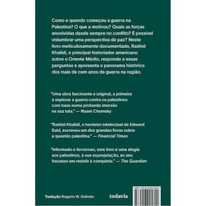Em março de 1899, Yusuf Diya al-Khalidi, deputado e ex-prefeito de Jerusalém, enviou uma carta alarmada a Theodor Herzl, considerado o pai do sionismo moderno. Na carta, argumentava que, quaisquer que fossem os méritos do movimento sionista, as “forças brutais das circunstâncias tinham que ser consideradas”, pois o povo palestino nunca aceitaria de bom grado ser suplantado. Ao alertar para os perigos futuros, ele concluía sua nota com um apelo sincero: “em nome de Deus, deixem a Palestina em paz”. Assim, Rashid Khalidi, o principal historiador americano sobre o Oriente Médio, inicia o seu relato sobre a guerra secular na Palestina. Com uma narrativa clara e equilibrada, Khalidi subverte as interpretações aceitas do conflito, que tendem, na melhor das hipóteses, a descrevê-lo como um confronto trágico entre dois povos que reivindicam o mesmo território. Para tanto, retraça os mais de cem anos da guerra, encampada primeiro pelo movimento sionista e depois por Israel, mas também com o apoio de grandes potências. Guiando os leitores pelos episódios-chave da campanha colonial, como a Declaração Balfour de 1917 e os confrontos de 1948 e 1967, o autor se vale de pesquisas de arquivo, material de familiares e das próprias experiências para revelar o pano de fundo histórico que enquadra os acontecimentos atuais, explicando dinâmicas subjacentes cruciais para uma compreensão adequada do presente.