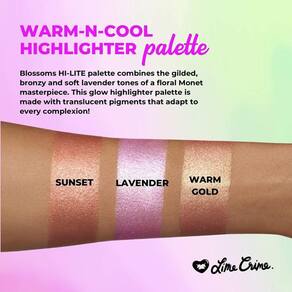 Lime Crime Hi Lite Warm In Cool Misture tons quentes e frios para criar seus próprios efeitos brilhantes e iridescentes. A paleta combina tons dourados, bronzeados e suaves de lavanda inspirados nas flores da natureza. Nossas paletas de realce de brilho são feitas com fórmula translúcida com ingredientes que se adaptam a cada tez