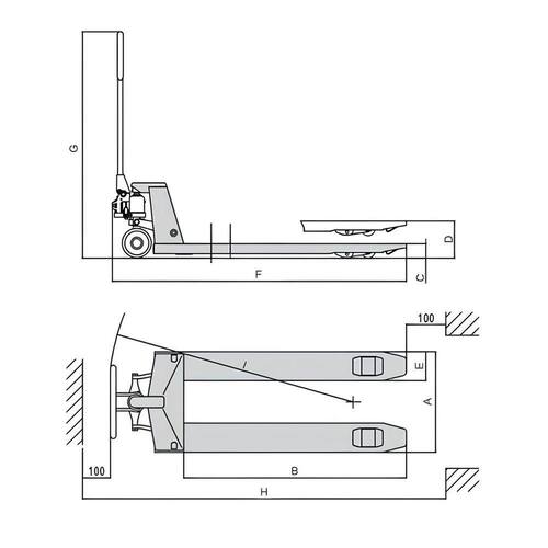 Conteúdo da embalagem: 1 Paleteira Carro Hidráulico 2500Kg 550X1150 mm Roda Duplo Nylon TP2510 Bovenau