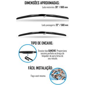 As palhetas de para-brisa possuem medidas de 26 e 22 polegadas, garantindo uma cobertura adequada para todo o para-brisa do veículo. Com haste em plástico semirrígido e fita de borracha, essa palheta proporciona maior aderência e limpeza, evitando riscos no vidro.