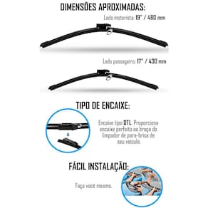 As palhetas possuem 19 polegadas 480mm para o lado do motorista e 17 polegadas 430mm para o lado do passageiro.