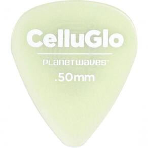 Palhetas brilhantes. A Planet Waves criou um novo diferencial para as palhetas de celuloide. Agora voce possui o toque natural e o timbre quente da celuloide em uma palheta que brilha no escuro! Simplesmente deixe-a na luz do sol ou embaixo de uma lampada e voce tera uma palheta que n?o so soa muito bem como tambem tem um otimo visual. As palhetas Cellu-Glo adicionam um novo elemento estetico em suas apresentac?es e s?o faceis de serem encontradas em um palco escuro. Disponivel nas medidas leve, media, pesada e extra pesada. Formato: Light; .055 mm; Standard.