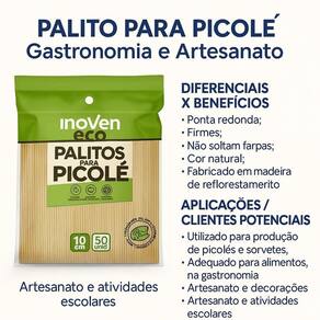 10 Pacotes de 50 Unidades de Palito de Picolé Inoven Eco Madeira Natural 10cm 500 unidades A precisão que você precisa na depilação com o cuidado que sua pele merece Palitos de Madeira Multiuso Qualidade Premium para Depilação, Artesanato e Gastronomia Com 10cm de comprimento e ponta arredondada, esses palitos de madeira são perfeitos para ou doméstico na depilação com cera, garantindo aplicação precisa e segura. Feitos com madeira de reflorestamento, são firmes, não soltam farpas e possuem acabamento suave ao toque. Além da depilação, são ideais para picolés artesanais, maçãs do amor, doces gourmet, decorações, atividades escolares e projetos criativos. Diferenciais e Benefícios: Ponta arredondada que evita machucados Madeira natural de reflorestamento Textura firme e segura para aplicação de cera quente Não solta farpas Versátil: beleza, gastronomia e artesanato Principais Aplicações: Depilação do buço, axilas, pernas e outras áreas Confeitaria: ideal para picolés, maçãs carameladas e doces Artesanato escolar e projetos DIY criativos Palito para depilação, palito de picolé madeira, palito para artesanato, palito de madeira 10cm, palito para cera quente, palito para confeitaria, palito para maçã do amor, palito ponta redonda, palito madeira multifuncional, palito depilatório