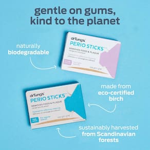 - Suave para as gengivas — Projetado para oferecer eficácia e conforto, o Perio Sticks limpa os dentes enquanto estimula a saúde da gengiva usando pontas de bétula macias e arredondadas que deslizam facilmente sem raspagem severa