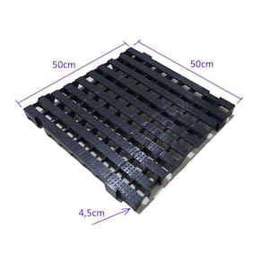 Estrado Plástico Preto em PP Polipropileno nas medidas de 4,5x50x50cm. Para cada metro quadrado são utilizadas 4 peças. Encaixe modular perfeito, que possibilita montagem na largura e no comprimento dos estrados. Principais aplicações: - Estoques e armazenagem de carga; - Almoxarifados; - Baús e carrocerias de caminhões e furgões; - Dormidouro ou criadouros de pequenos ou grandes animais; - Mecânicas; - Decoração; - Área de lazer; - Sanitários, saunas e piscinas etc; - Leve, prático e seguro; - Se adapta em qualquer superfície planas; - Formato retangular e encaixes perfeitos permite vários layouts de montagem; - Sem necessidade de ferramentas para montagem; - Alta vazão no escoamento de líquidos; - Reciclável. Marca: Marwell